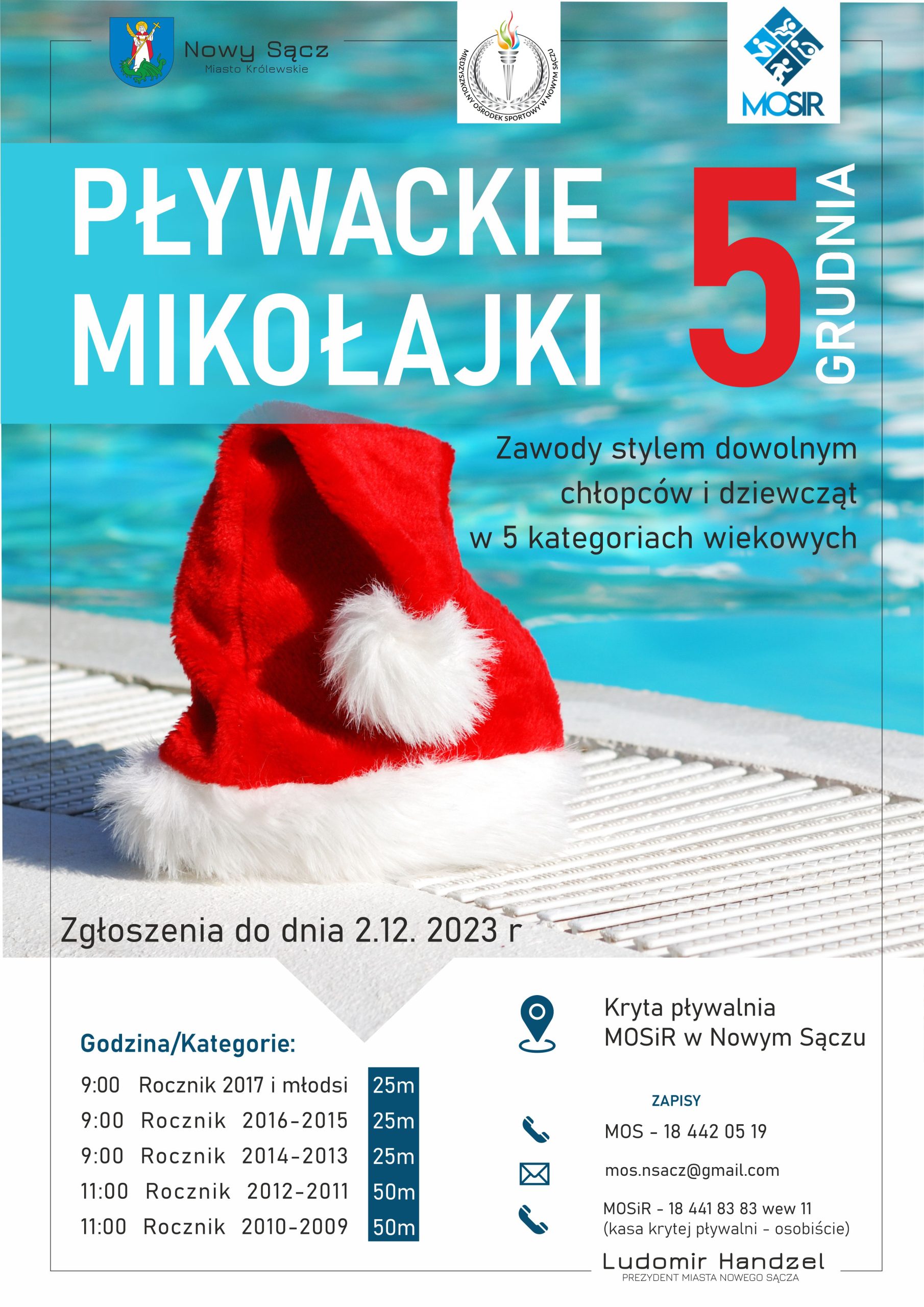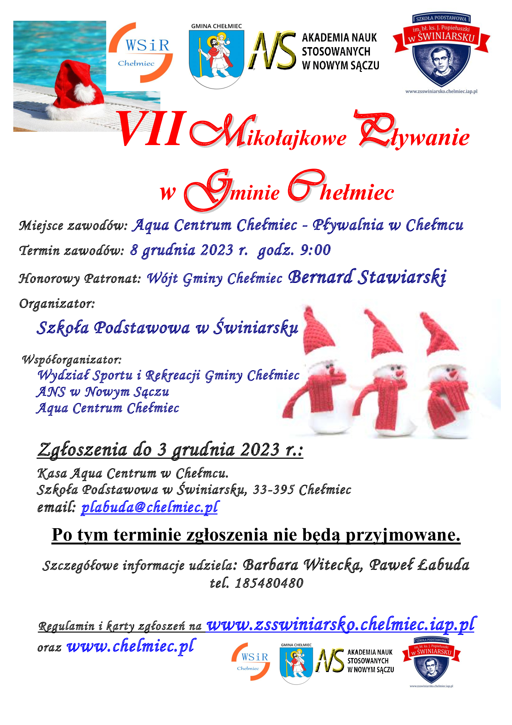VII Mikołajkowe Pływanie Gminy Chełmiec odbędzie się 8 grudnia 2023 r. w Aqua Centrum Chełmiec w godzinach od 9:00 do 12:30.